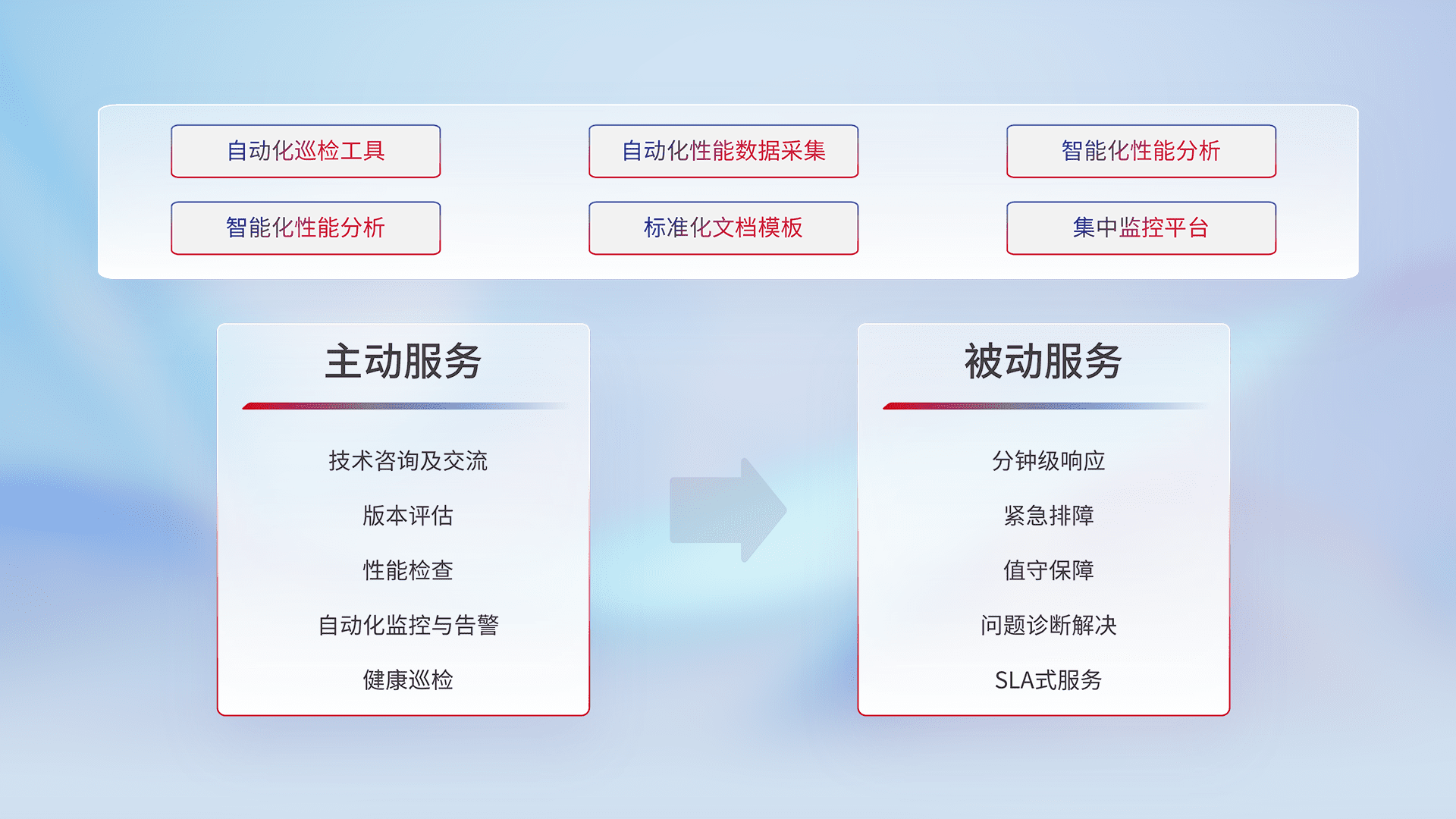 智能化工具和标准化文档,,,,保障服务质量,,提供主动服务(包含技术咨询、、、、版本评估、、、、性能检查、、、、自动化监控与告警、、、、健康巡检)和被动服务包含(分钟级响应、、、、紧急排障、、、值守保障、、问题诊断解决、、SLA服务)。。。