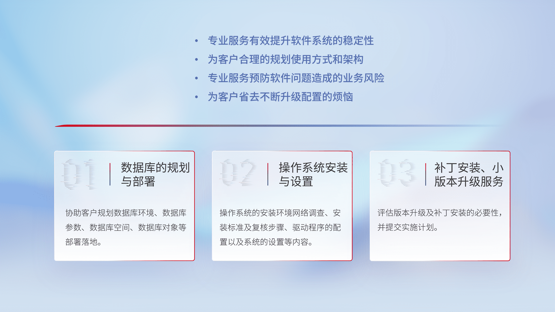 为客户提供软件规模升级、、、、快速部署、、、按需配置的专业服务,,从数据库的规划与部署到操作系统的安装与设置,,,再到补丁安装和小版本升级提供支持。。