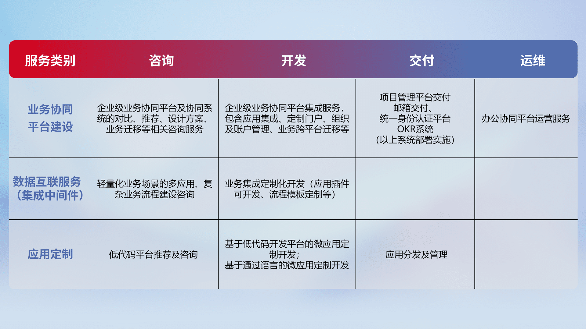 针对钉钉、、、、企微、、、IDaas等平台级产品提供产品的规划、、、、方案、、、、交付、、、定制化开发等服务,,,实现如统一协同办公、、、智能客户服务、、混合会议管理、、智能数据查询、、等业务场景,,,,实现数字化转型。。